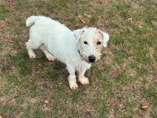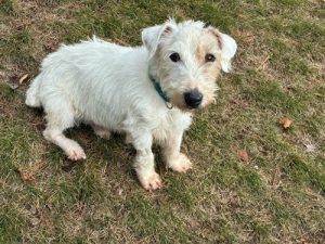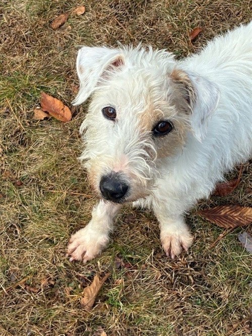 Finley is a 6-year-old rough coat male Jack Russell Terrier, white with a small amount of brown on his face, who weighs about 16 pounds. Finley came to us when the breeder closed her doors and we were asked to take in some of her stud dogs.