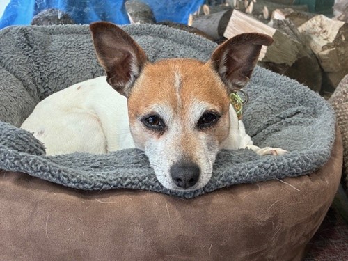 Ralphie is a 6-year-old, 13-pound brown and white smooth coat JRT cross male with a lovely undocked tail.